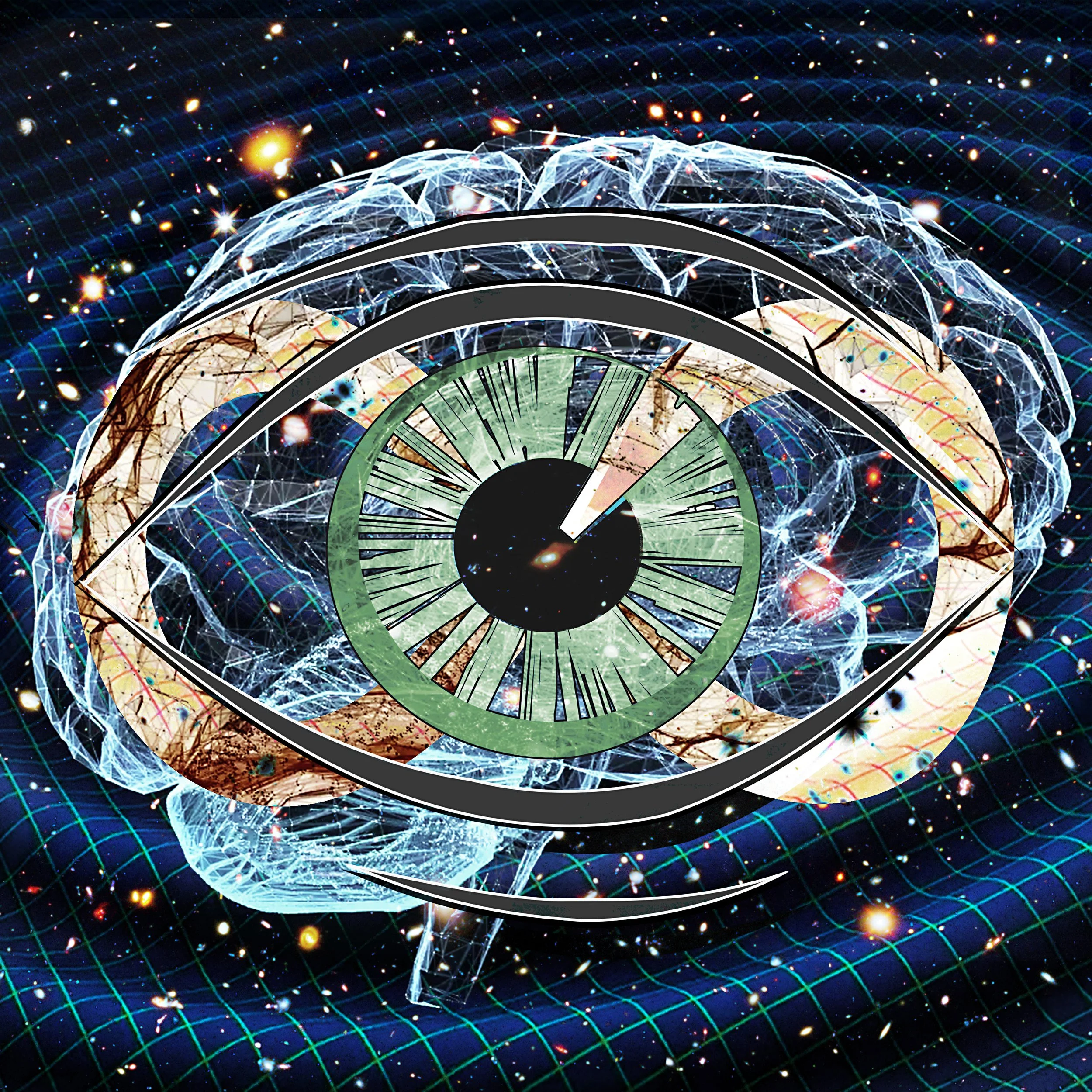The composition centers on a large, stylized eye superimposed over an intricate rendering of a brain, instantly fusing the macrocosmic and microcosmic. The brain—built from translucent, electric-blue lines and a web-like, holographic structure—suggests living circuitry: the subtle mental, energetic substance through which experiential existence is formed. The eye’s iris, rendered in rich green hues and segmented geometry, resembles a clock face, pie chart, or mechanical instrument, introducing an analytical, scientific undertone—an elegant nod to lawfulness: mind is not vague sentiment; it operates by principles. The pupil is intense and black, yet transparent enough to reveal galaxies within it, grounding the central revelation in a single focal point: the cosmos is inside Mind, and Mind is looking through you, from within you, as you.